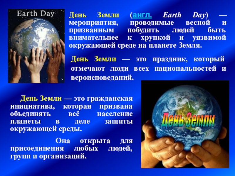 День Земли — это праздник, который отмечают люди всех национальностей и вероисповеданий.