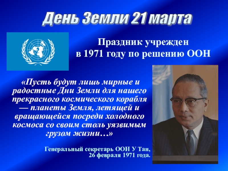 «Пусть будут лишь мирные и радостные Дни Земли для нашего прекрасного космического корабля — планеты Земля, летящей и вращающейся посреди холодного космоса со своим столь уязвимым грузом жизни…»