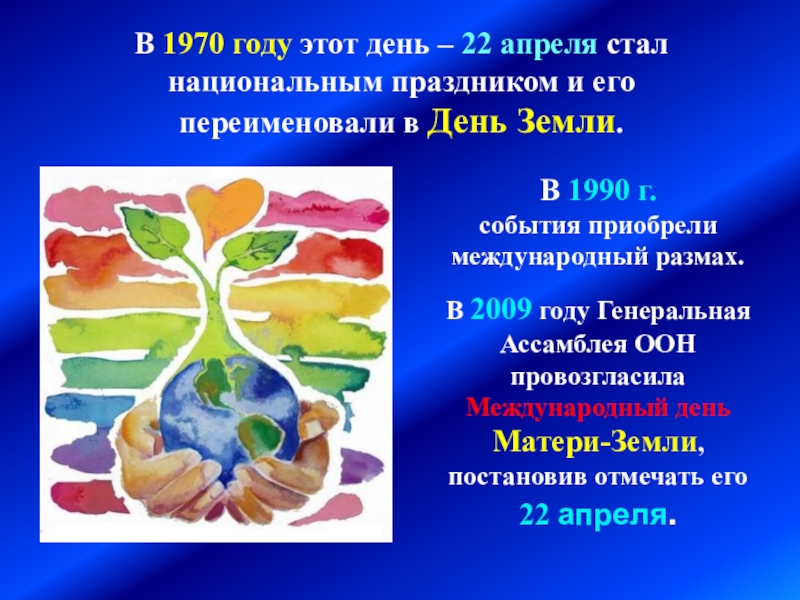 В 2009 году Генеральная Ассамблея ООН провозгласила Международный день Матери-Земли, постановив отмечать его