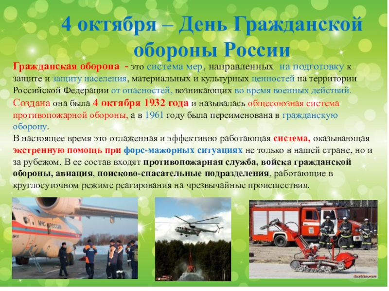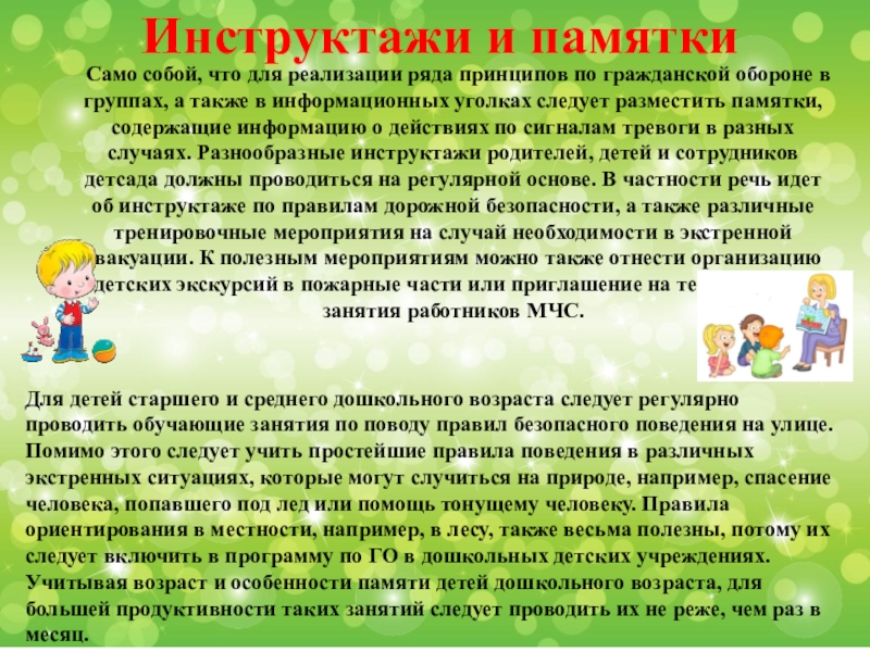 Для реализации принципов гражданской обороны среди детей, должны быть запланированы, а затем и осуществлены специальные мероприятия с участием воспитанников старшего дошкольного возраста, которые находятся в детском саду.