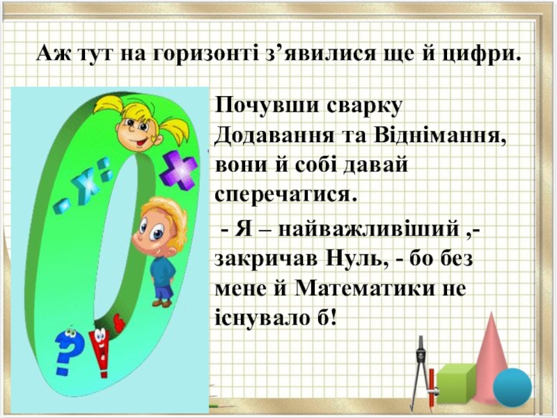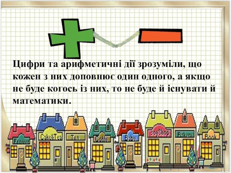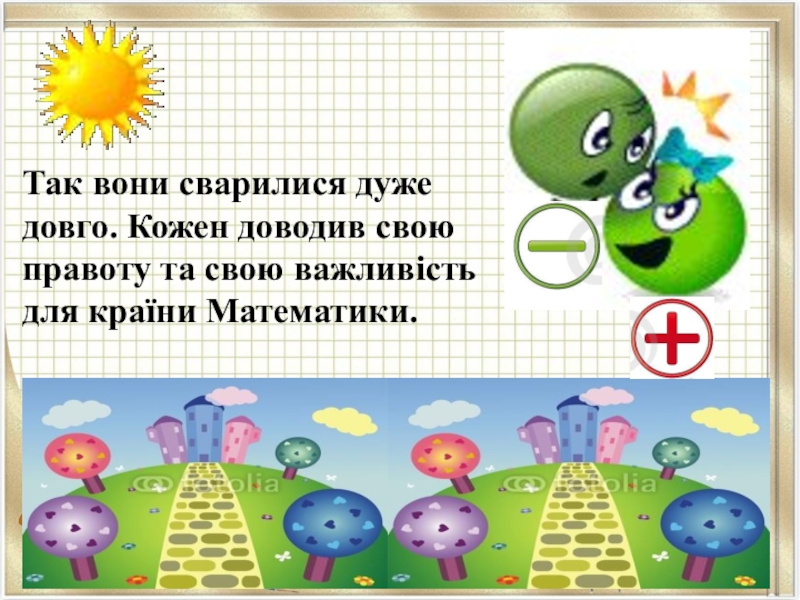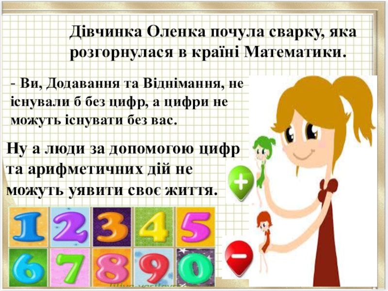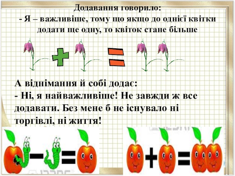 А віднімання й собі додає: - Ні, я найважливіше! Не завжди ж все додавати. Без мене б не існувало ні торгівлі, ні життя!