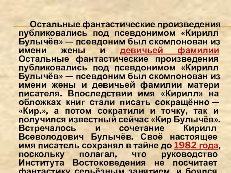 «Кирилл Булычёв» — псевдоним был скомпонован из имени жены и девичьей фамилии Остальные фантастические произведения публиковались под псевдонимом «Кирилл Булычёв» — псевдоним был скомпонован из имени жены и девичьей фамилии матери писателя. Впоследствии имя «Кирилл» на обложках книг стали писать сокращённо — «Кир.», а потом сократили и точку, так и получился известный сейчас «Кир Булычёв». Встречалось и сочетание Кирилл Всеволодович Булычёв. Своё настоящее имя писатель сохранял в тайне до 1982 года, поскольку полагал, что руководство Института Востоковедения не посчитает фантастику серьёзным занятием, и боялся, что после раскрытия псевдонима будет уволен.