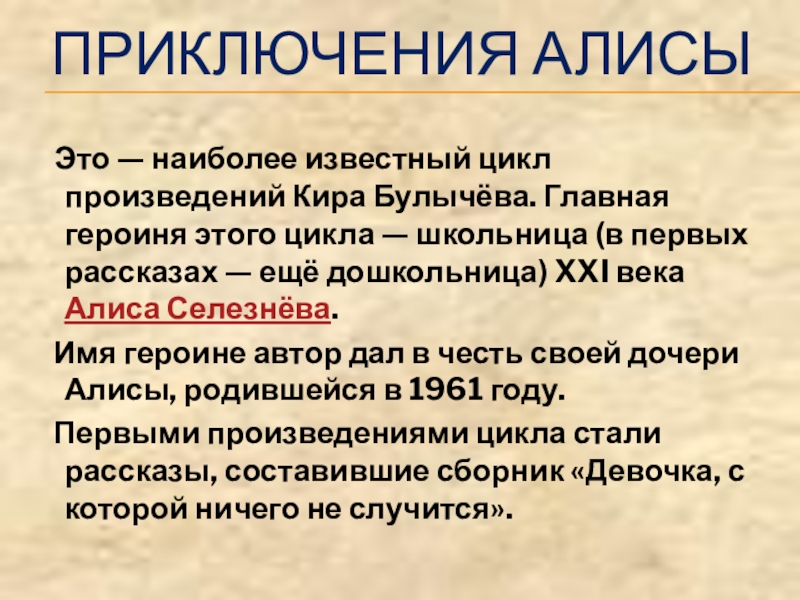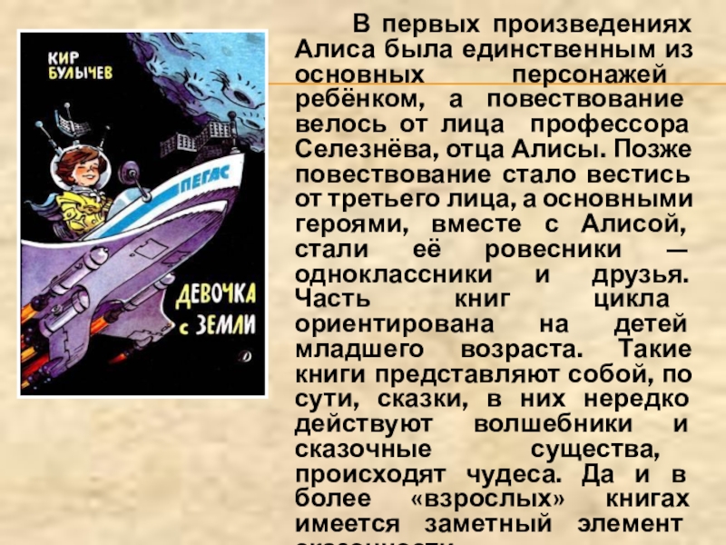 основных персонажей ребёнком, а повествование велось от лица профессора Селезнёва, отца Алисы. Позже повествование стало вестись от третьего лица, а основными героями, вместе с Алисой, стали её ровесники — одноклассники и друзья. Часть книг цикла ориентирована на детей младшего возраста. Такие книги представляют собой, по сути, сказки, в них нередко действуют волшебники и сказочные существа, происходят чудеса. Да и в более «взрослых» книгах имеется заметный элемент сказочности.