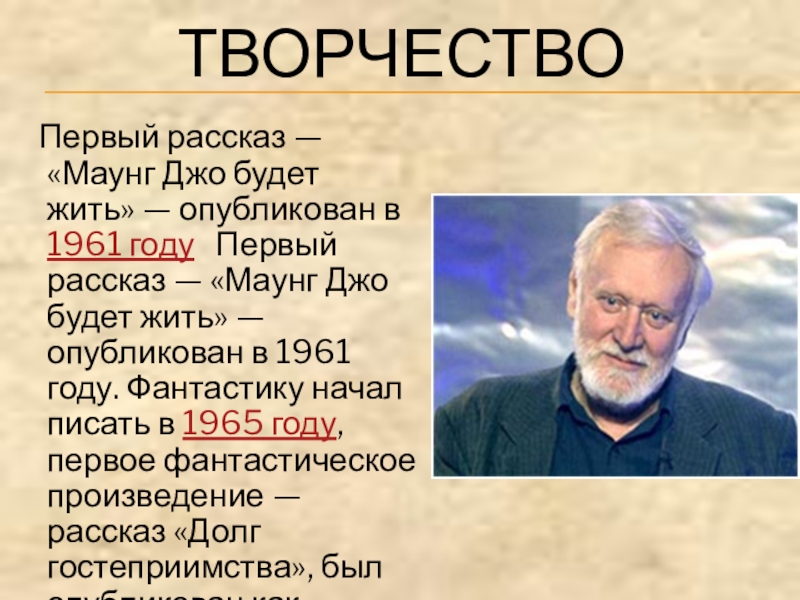 1961 году Первый рассказ — «Маунг Джо будет жить» — опубликован в 1961 году. Фантастику начал писать в 1965 году, первое фантастическое произведение — рассказ «Долг гостеприимства», был опубликован как «перевод рассказа бирманского писателя Маун Сейн Джи».
