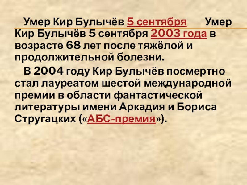 Слайд 6 Умер Кир Булычёв 5 сентября