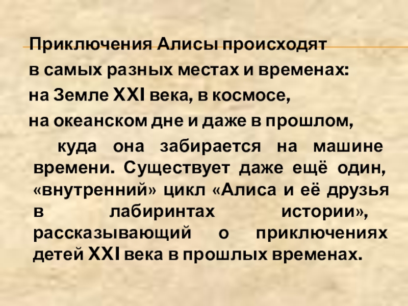 куда она забирается на машине времени. Существует даже ещё один, «внутренний» цикл «Алиса и её друзья в лабиринтах истории», рассказывающий о приключениях детей XXI века в прошлых временах.