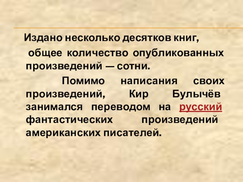 Помимо написания своих произведений, Кир Булычёв занимался переводом на русский фантастических произведений американских писателей.