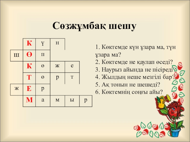 Сөзжұмбақ шешу1. Көктемде күн ұзара ма, түн ұзара ма?2. Көктемде не қаулап өседі?3. Наурыз айында не пісіреді?4.
