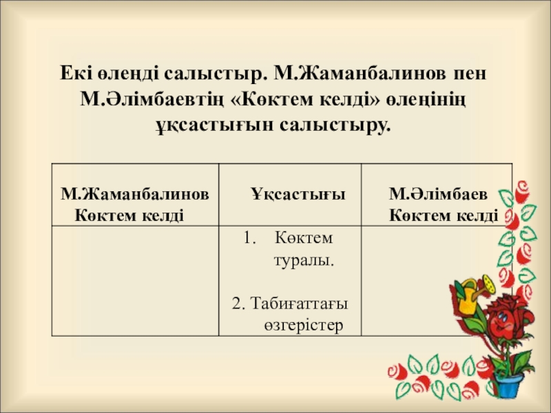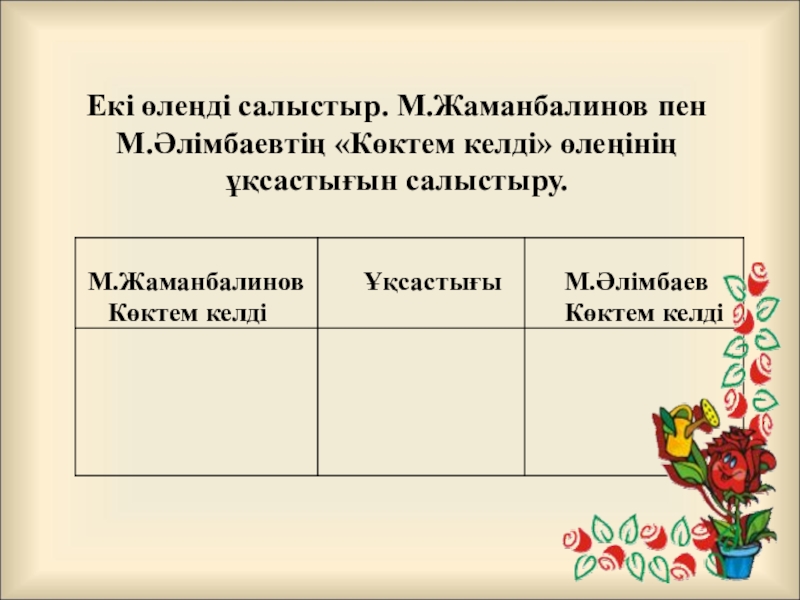 Слайд 16Екі өлеңді салыстыр. М.Жаманбалинов пен М.Әлімбаевтің «Көктем келді» өлеңінің ұқсастығын салыстыру.
