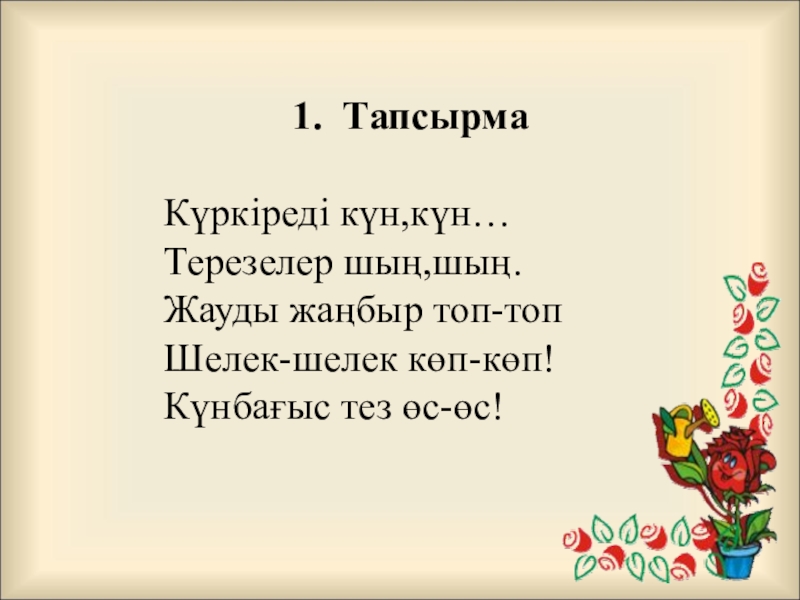 ТапсырмаКүркіреді күн,күн…Терезелер шың,шың.Жауды жаңбыр топ-топШелек-шелек көп-көп!Күнбағыс тез өс-өс!