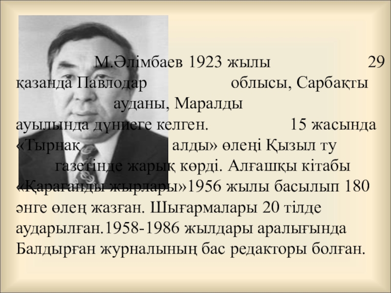 М.Әлімбаев 1923 жылы 29 қазанда Павлодар облысы, Сарбақты ауданы, Маралды