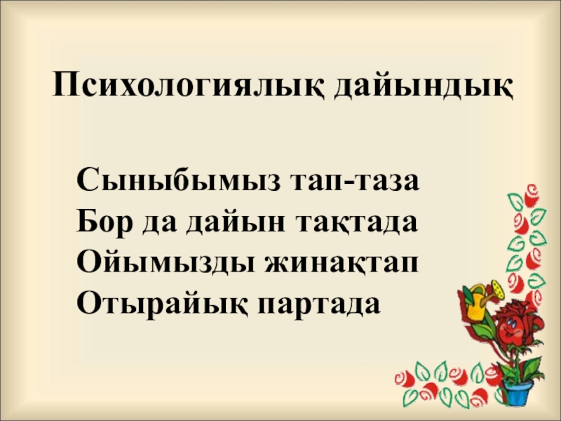 Сыныбымыз тап-тазаБор да дайын тақтадаОйымызды жинақтапОтырайық партадаПсихологиялық дайындық