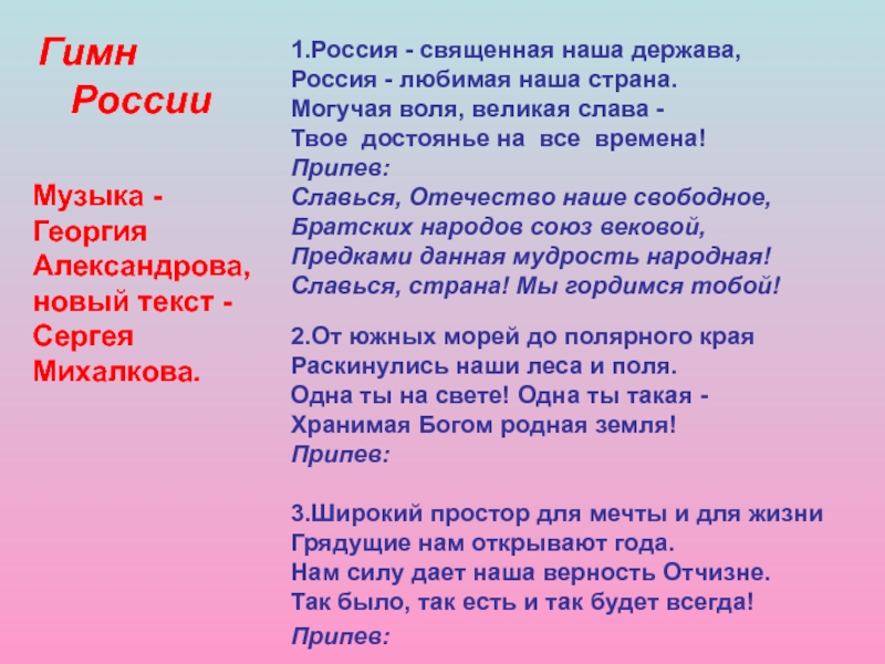 Музыка - Георгия Александрова, новый текст - Сергея Михалкова.
