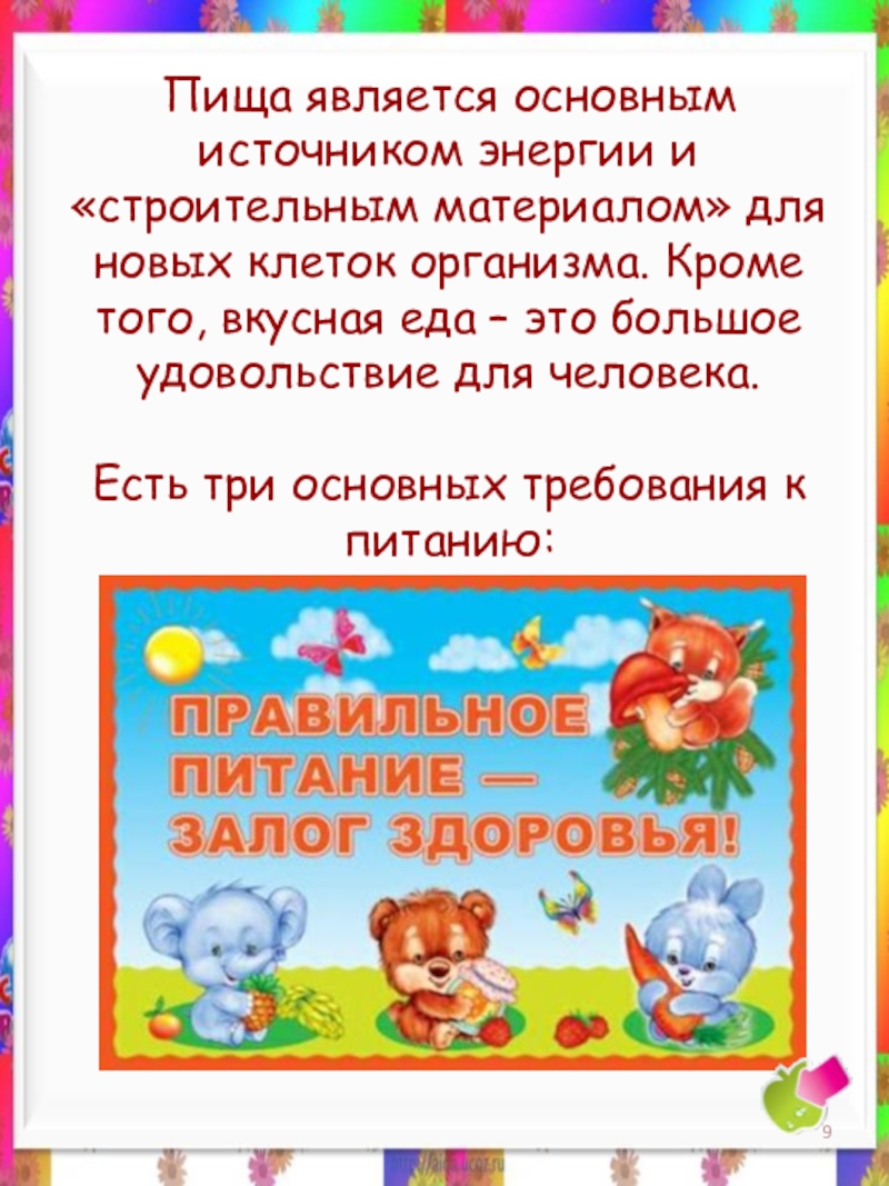 Слайд 9Пища является основным источником энергии и «строительным материалом» для новых клеток