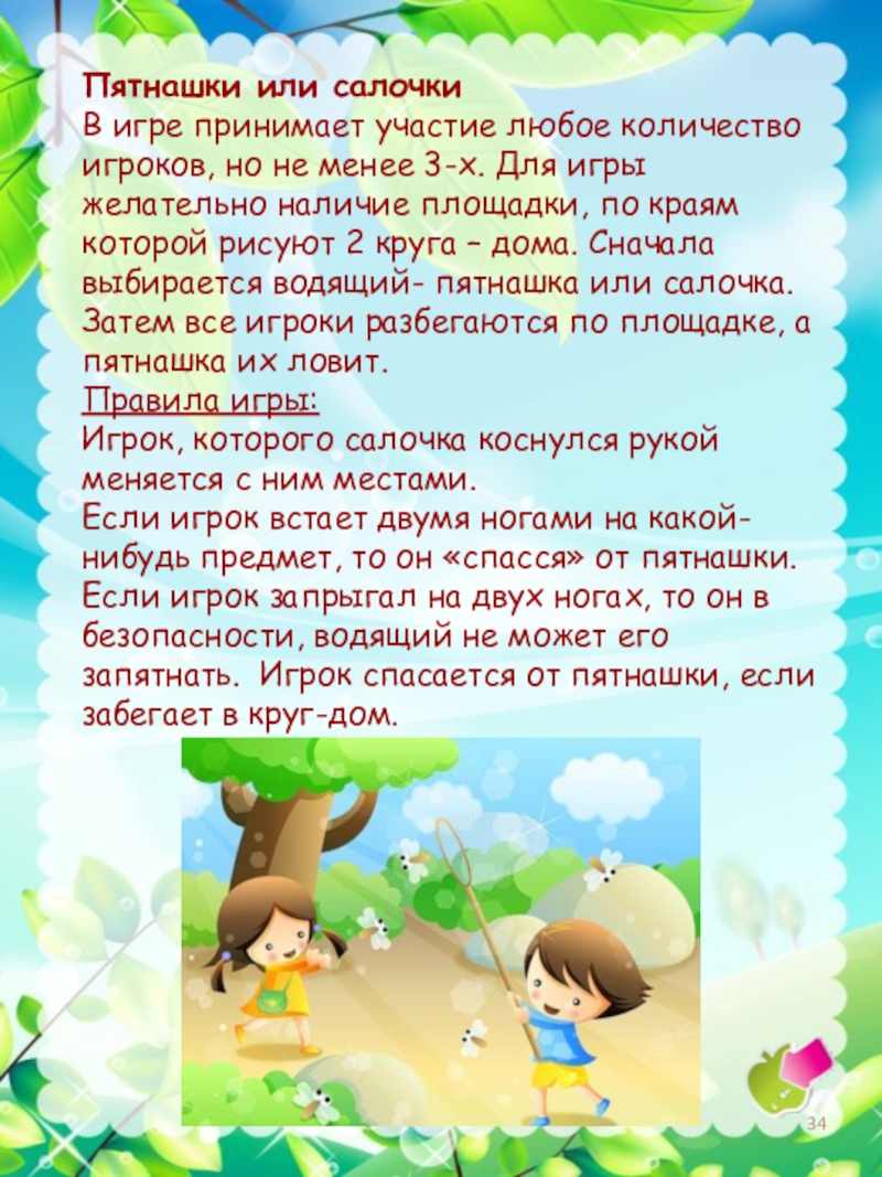менее 3-х. Для игры желательно наличие площадки, по краям которой рисуют 2 круга – дома. Сначала выбирается водящий- пятнашка или салочка. Затем все игроки разбегаются по площадке, а пятнашка их ловит.