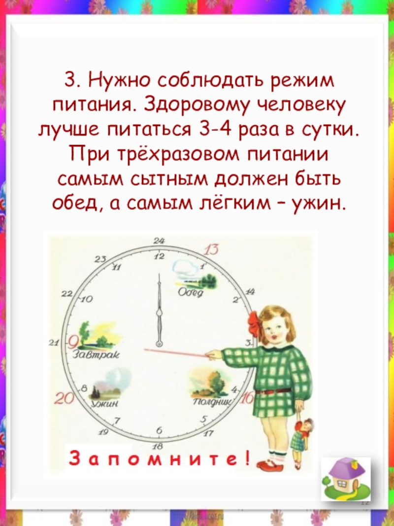 Слайд 123. Нужно соблюдать режим питания. Здоровому человеку лучше питаться 3-4 раза