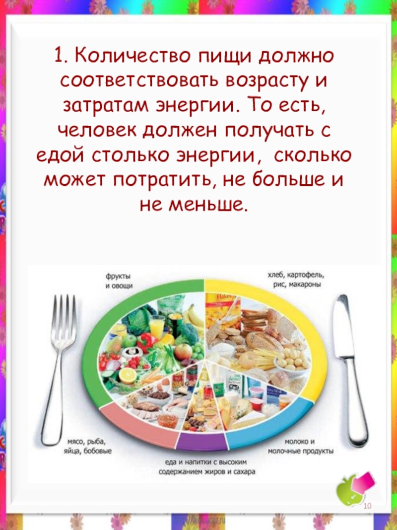 Слайд 101. Количество пищи должно соответствовать возрасту и затратам энергии. То есть,