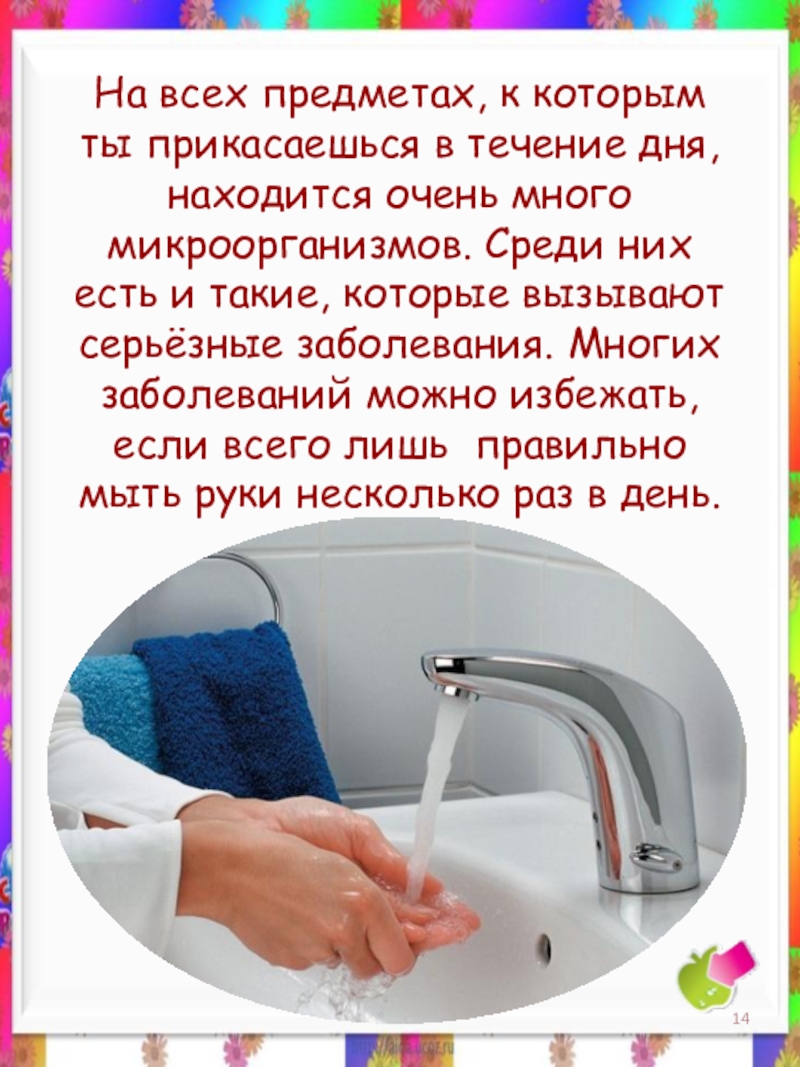 очень много микроорганизмов. Среди них есть и такие, которые вызывают серьёзные заболевания. Многих заболеваний можно избежать, если всего лишь правильно мыть руки несколько раз в день.