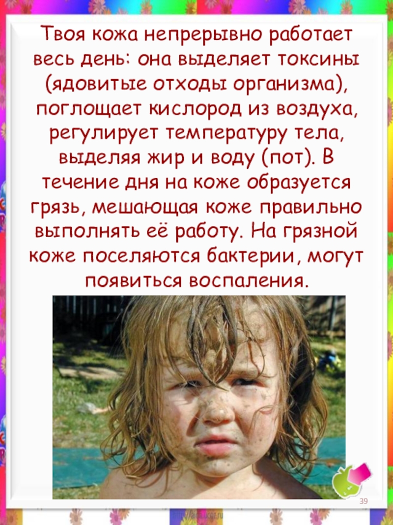 Слайд 39Твоя кожа непрерывно работает весь день: она выделяет токсины (ядовитые отходы