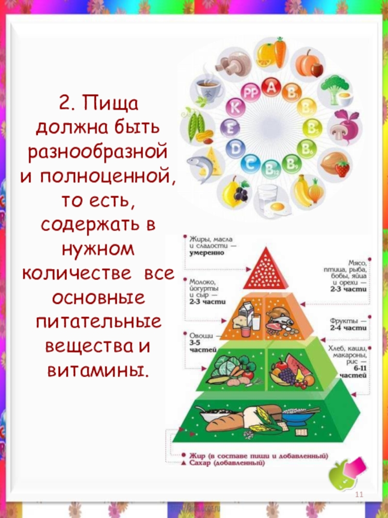 Слайд 112. Пища должна быть разнообразной и полноценной, то есть, содержать в