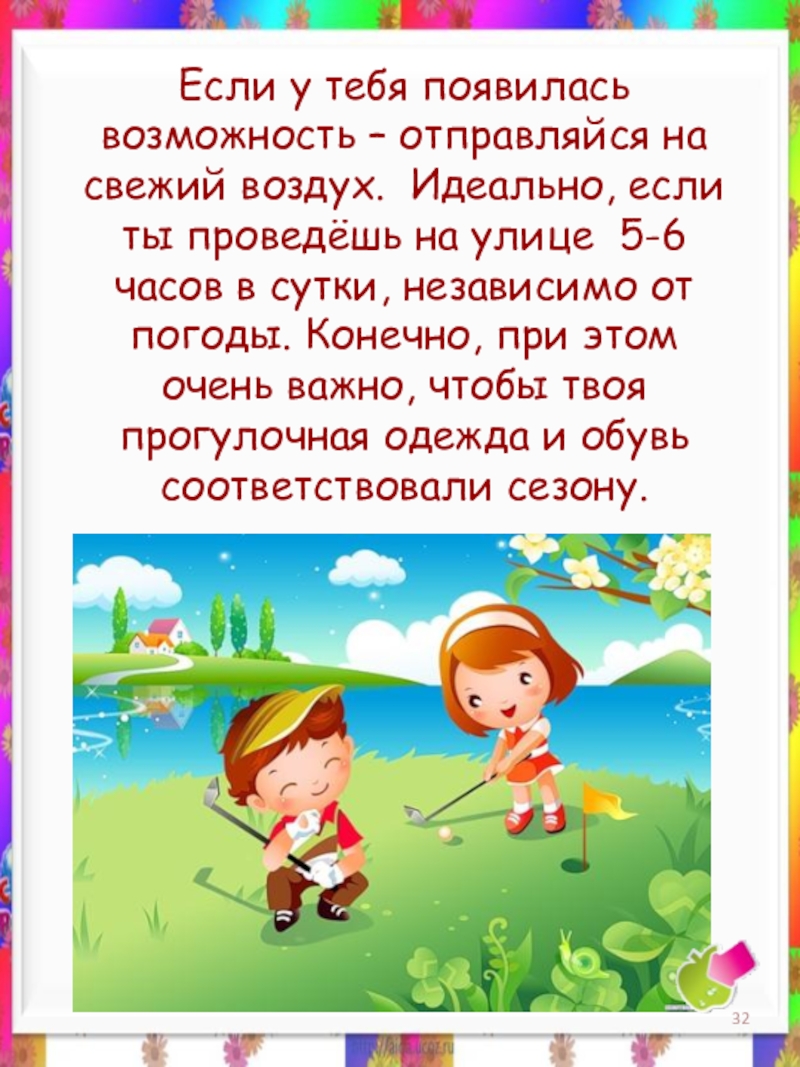 Слайд 32Если у тебя появилась возможность – отправляйся на свежий воздух. Идеально,