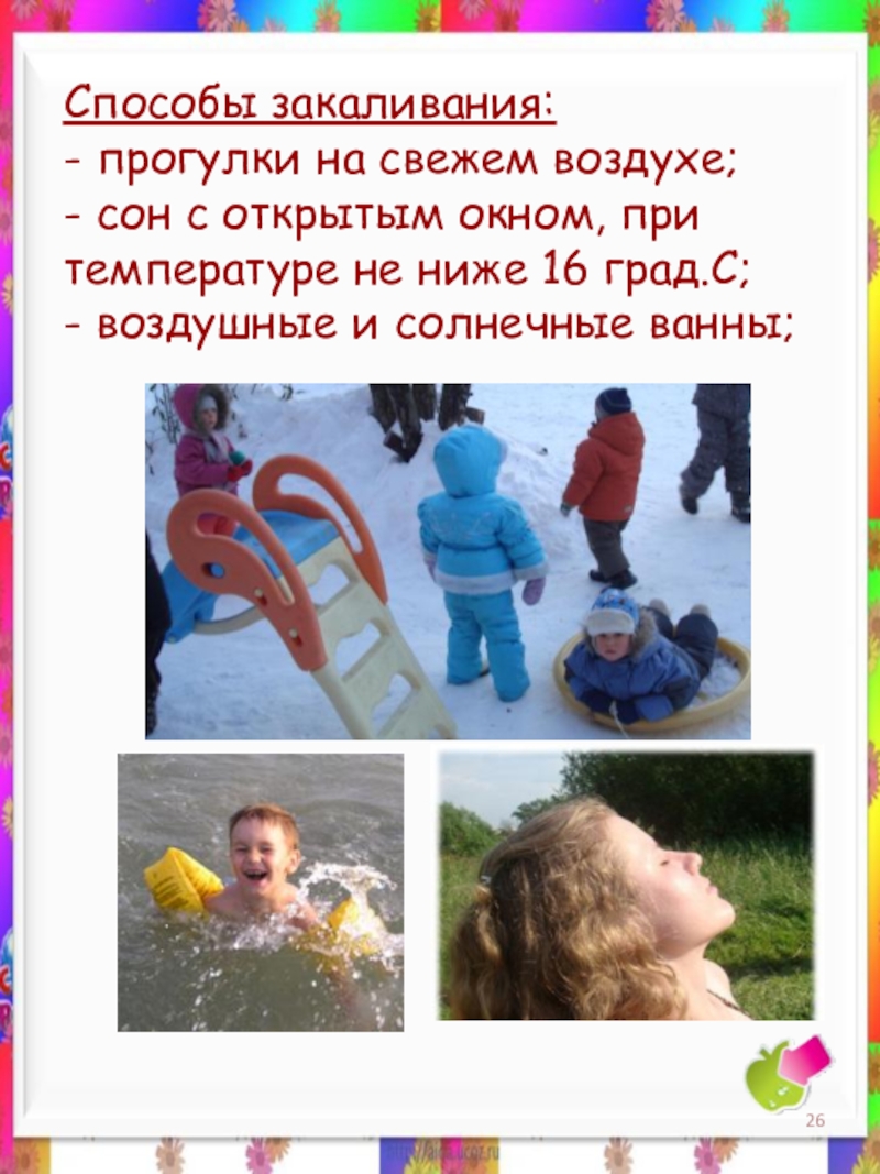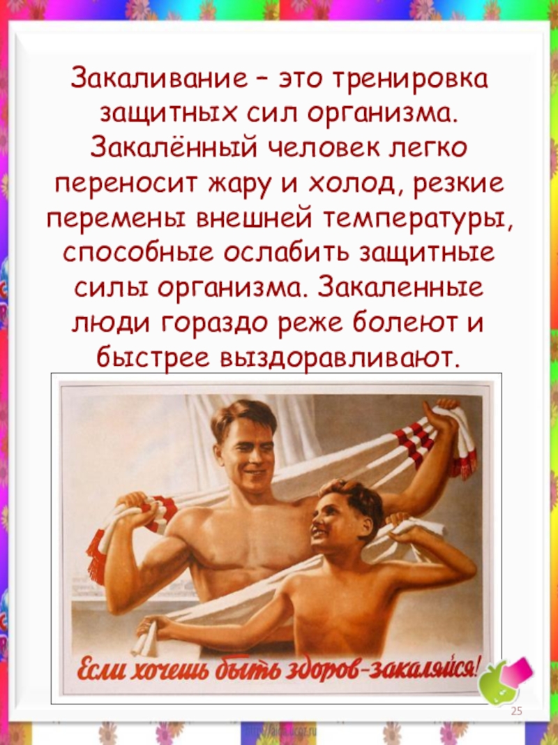 Слайд 25Закаливание – это тренировка защитных сил организма. Закалённый человек легко переносит