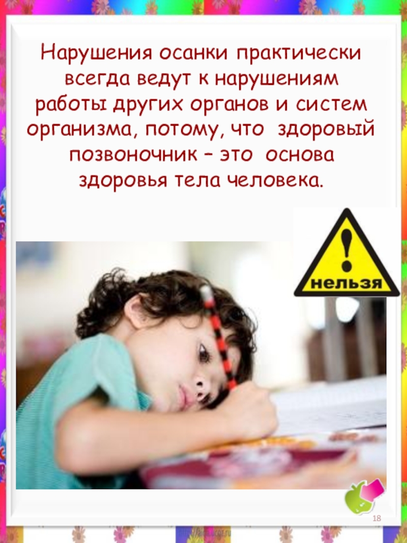 Слайд 18Нарушения осанки практически всегда ведут к нарушениям работы других органов и