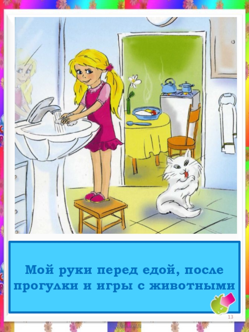 Слайд 13Мой руки перед едой, после прогулки и игры с животными