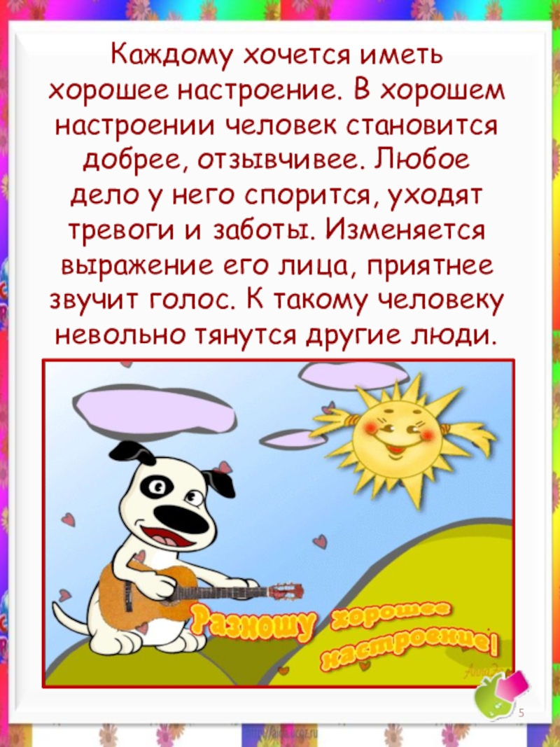 Слайд 5Каждому хочется иметь хорошее настроение. В хорошем настроении человек становится добрее,