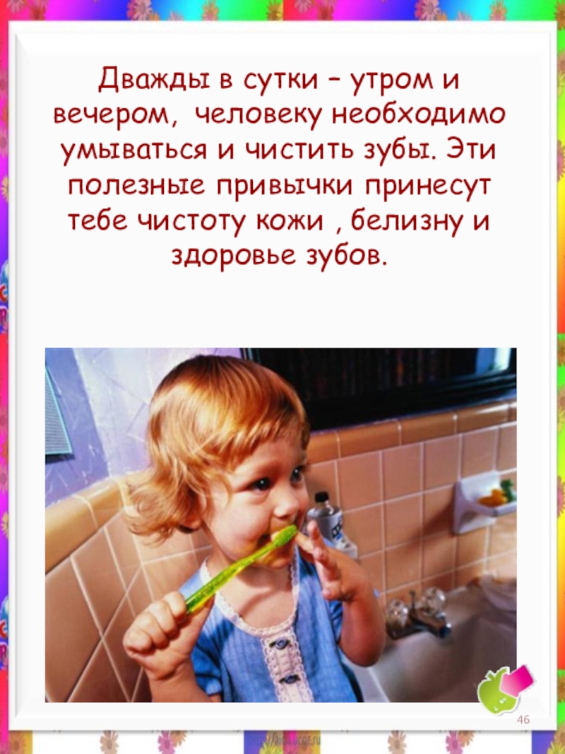 Слайд 46Дважды в сутки – утром и вечером, человеку необходимо умываться и