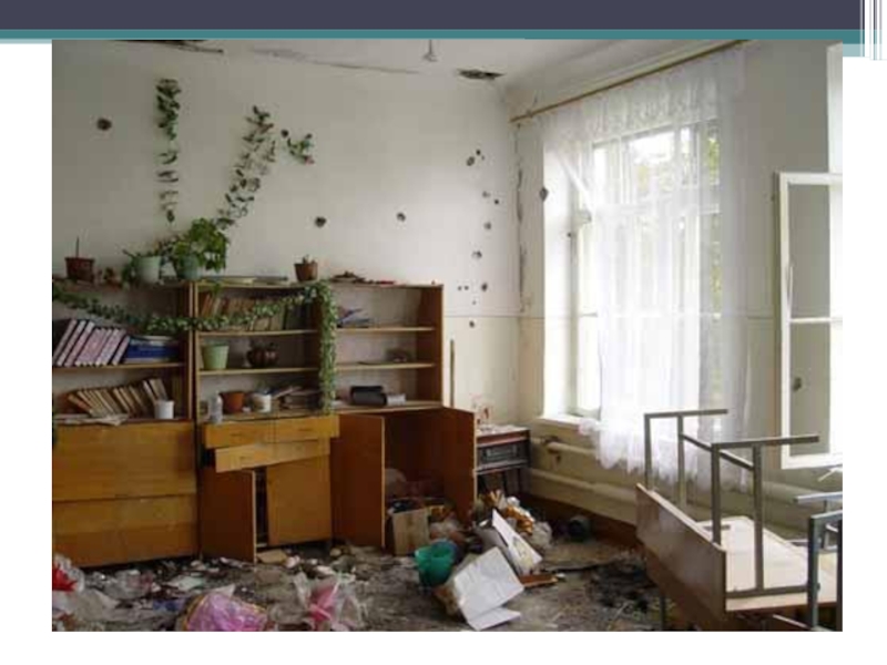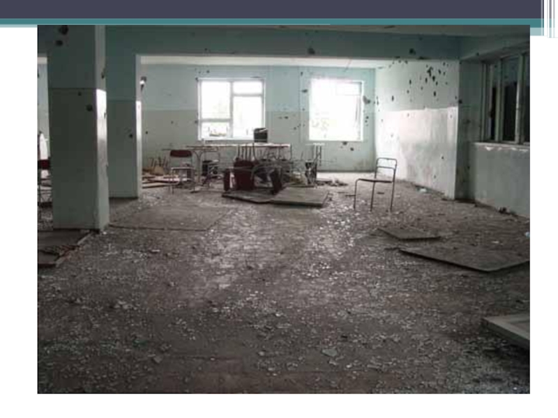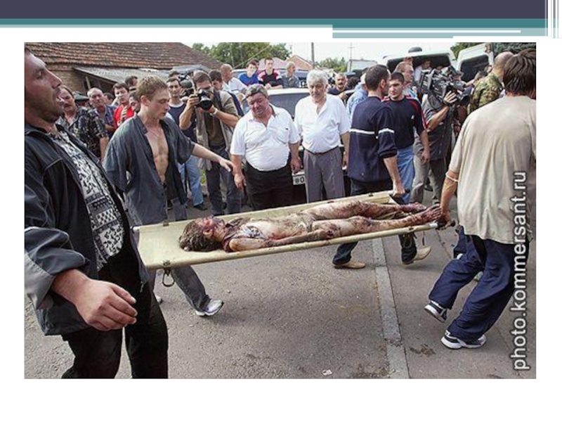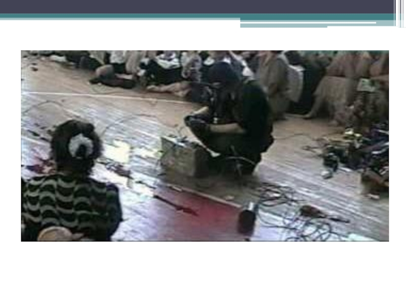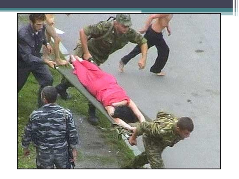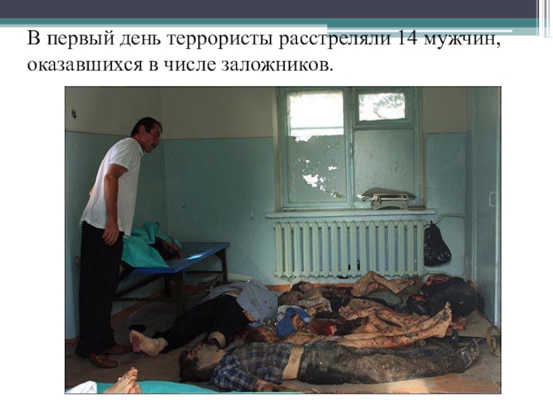 Слайд 9В первый день террористы расстреляли 14 мужчин, оказавшихся в числе заложников.