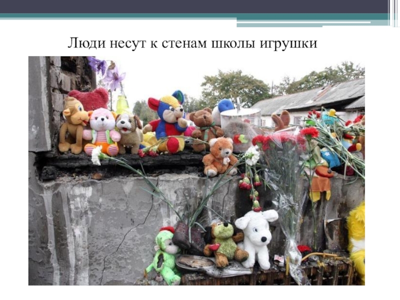 Слайд 43 Люди несут к стенам школы игрушки