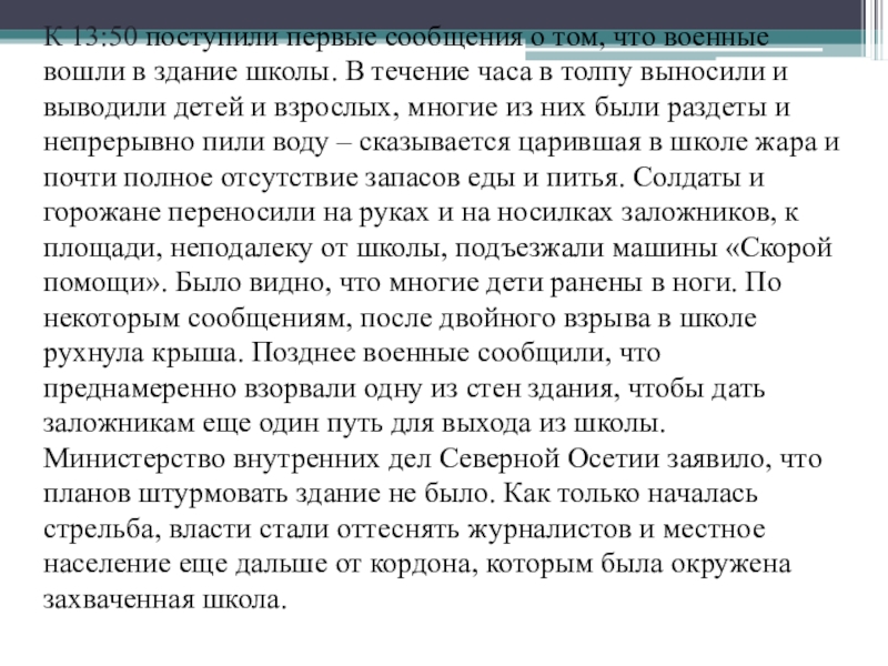 здание школы. В течение часа в толпу выносили и выводили детей и взрослых, многие из них были раздеты и непрерывно пили воду – сказывается царившая в школе жара и почти полное отсутствие запасов еды и питья. Солдаты и горожане переносили на руках и на носилках заложников, к площади, неподалеку от школы, подъезжали машины «Скорой помощи». Было видно, что многие дети ранены в ноги. По некоторым сообщениям, после двойного взрыва в школе рухнула крыша. Позднее военные сообщили, что преднамеренно взорвали одну из стен здания, чтобы дать заложникам еще один путь для выхода из школы. Министерство внутренних дел Северной Осетии заявило, что планов штурмовать здание не было. Как только началась стрельба, власти стали оттеснять журналистов и местное население еще дальше от кордона, которым была окружена захваченная школа.