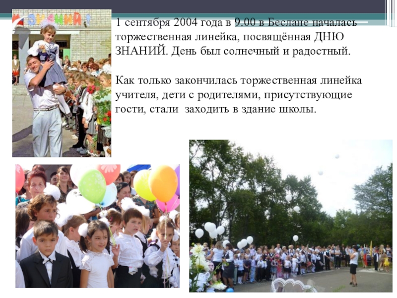 Слайд 41 сентября 2004 года в 9.00 в Беслане началась торжественная линейка,