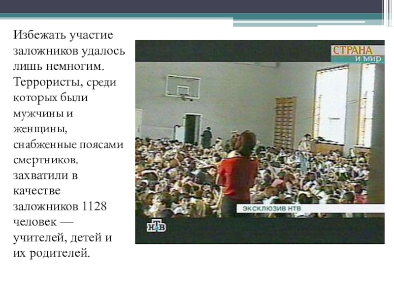 и женщины, снабженные поясами смертников. захватили в качестве заложников 1128 человек — учителей, детей и их родителей.