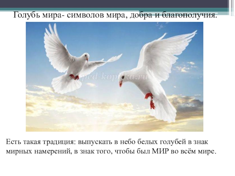 Слайд 50Голубь мира- символов мира, добра и благополучия.