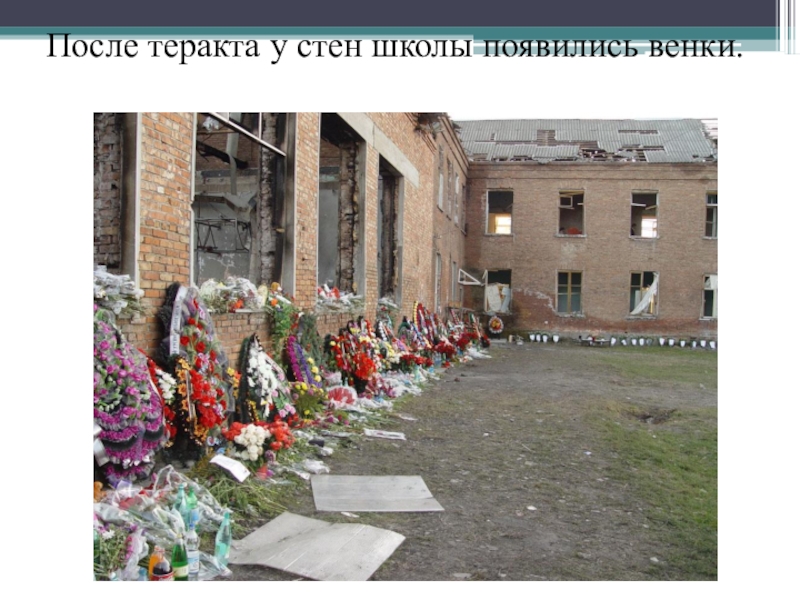 Слайд 39После теракта у стен школы появились венки.
