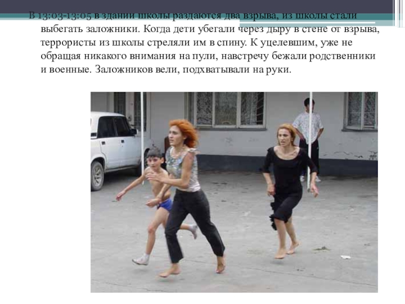 Слайд 18В 13:03-13:05 в здании школы раздаются два взрыва, из школы стали