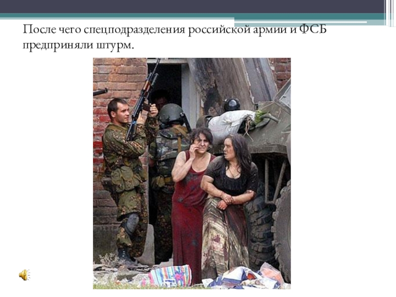 Слайд 19После чего спецподразделения российской армии и ФСБ предприняли штурм.