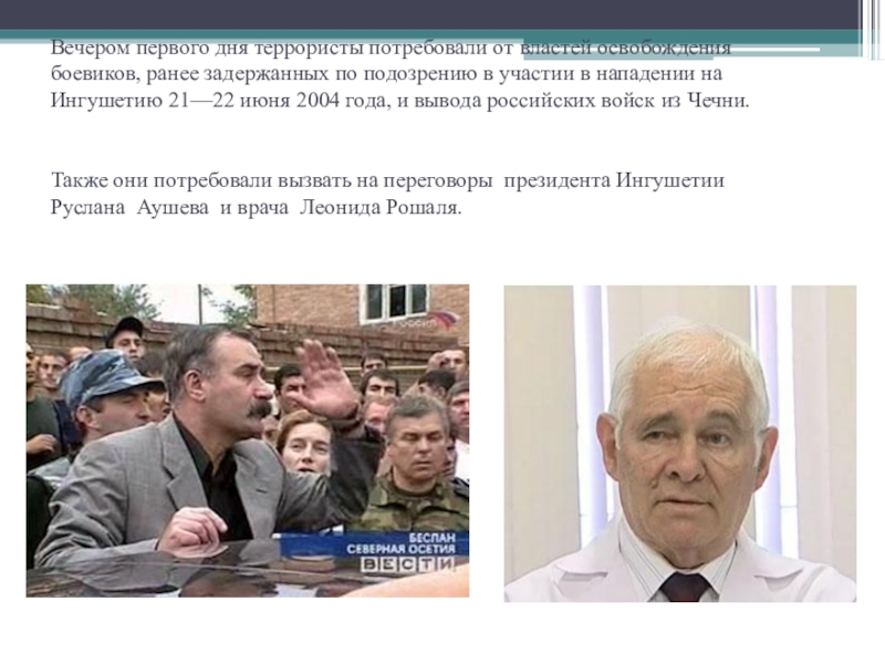Также они потребовали вызвать на переговоры президента Ингушетии Руслана Аушева и врача Леонида Рошаля.