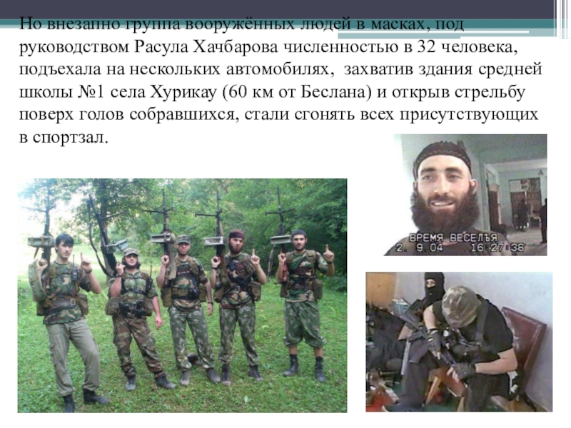 численностью в 32 человека, подъехала на нескольких автомобилях, захватив здания средней школы №1 села Хурикау (60 км от Беслана) и открыв стрельбу поверх голов собравшихся, стали сгонять всех присутствующих в спортзал.