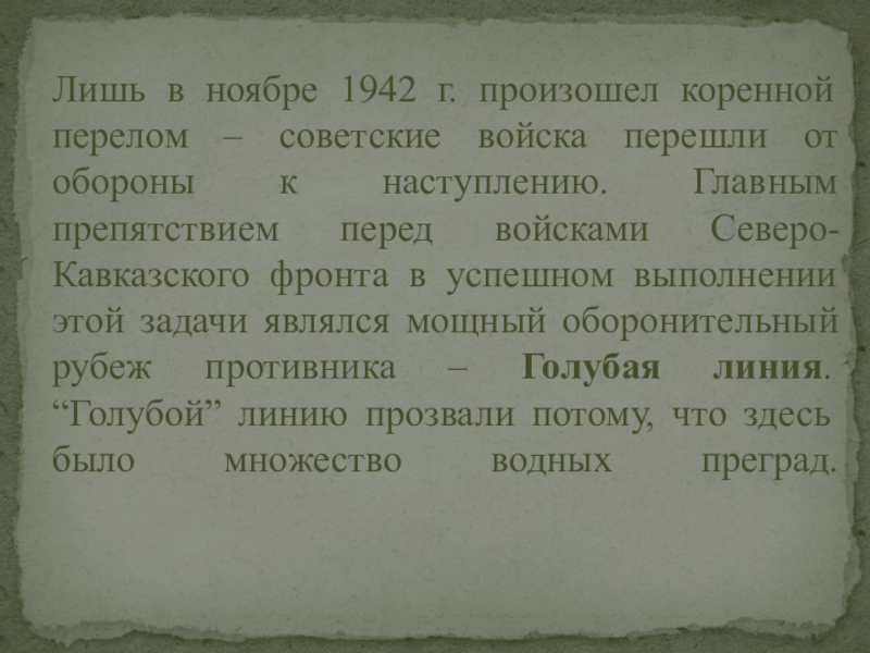 перешли от обороны к наступлению. Главным препятствием перед войсками Северо-Кавказского фронта в успешном выполнении этой задачи являлся мощный оборонительный рубеж противника – Голубая линия. “Голубой” линию прозвали потому, что здесь было множество водных преград.