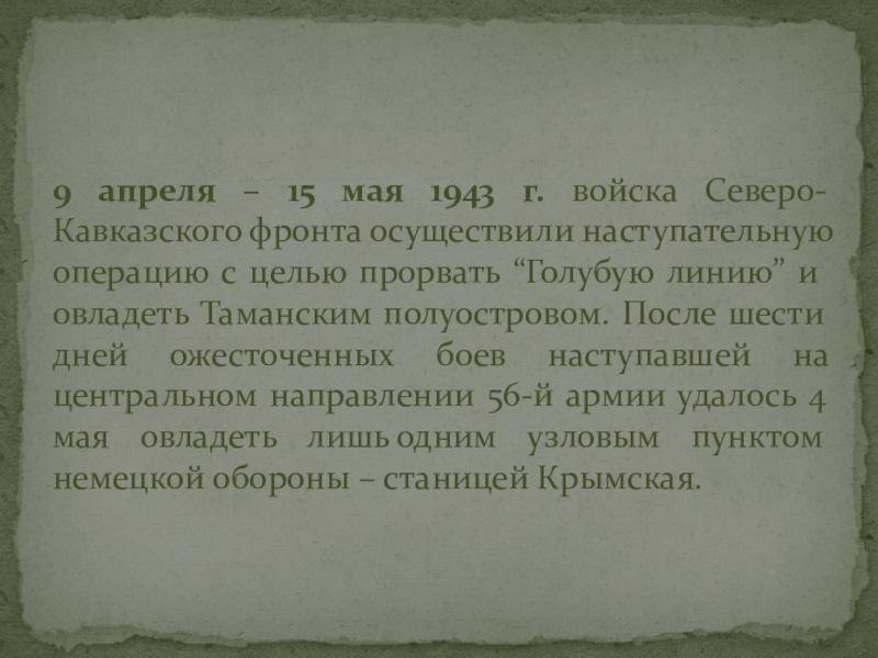 наступательную операцию с целью прорвать “Голубую линию” и овладеть Таманским полуостровом. После шести дней ожесточенных боев наступавшей на центральном направлении 56-й армии удалось 4 мая овладеть лишь одним узловым пунктом немецкой обороны – станицей Крымская.