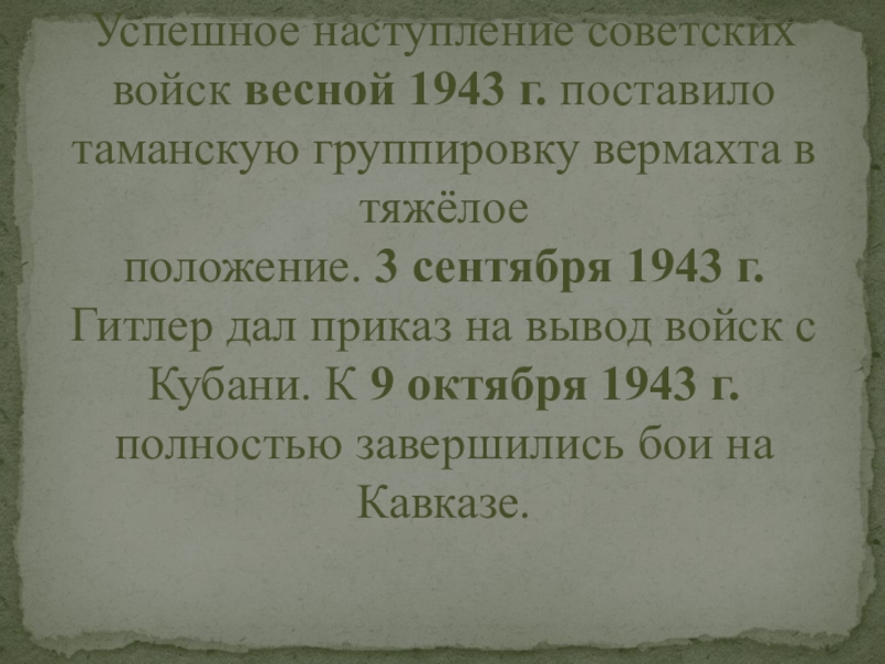 в тяжёлое положение. 3 сентября 1943 г. Гитлер дал приказ на вывод войск с Кубани. К 9 октября 1943 г. полностью завершились бои на Кавказе.