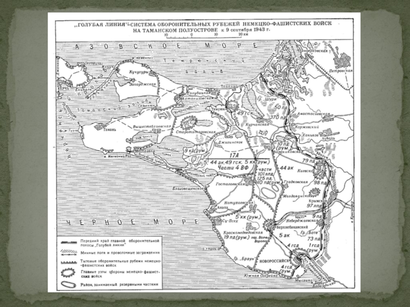 к строительству оборонительных рубежей в низовьях р. Кубань, На строительство этих рубежей гитлеровцы силой оружия согнали все местное население. Основная оборонительная полоса, непосредственно Голубая линия, имела глубину до 6 км, но следом за ней на глубину 30–40 км простирались хорошо укрепленные рубежи.