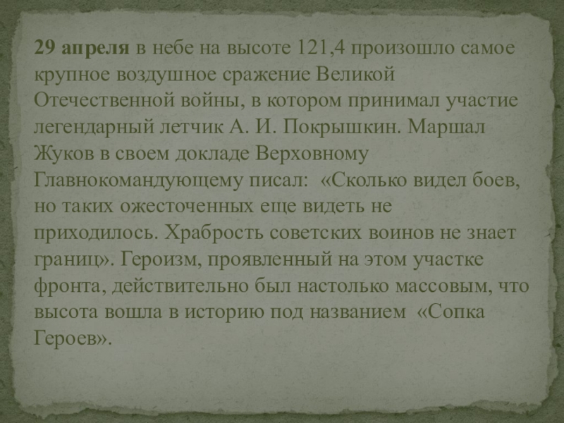 Слайд 1329 апреля в небе на высоте 121,4 произошло самое крупное воздушное
