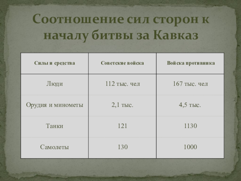 Слайд 6Соотношение сил сторон к началу битвы за Кавказ