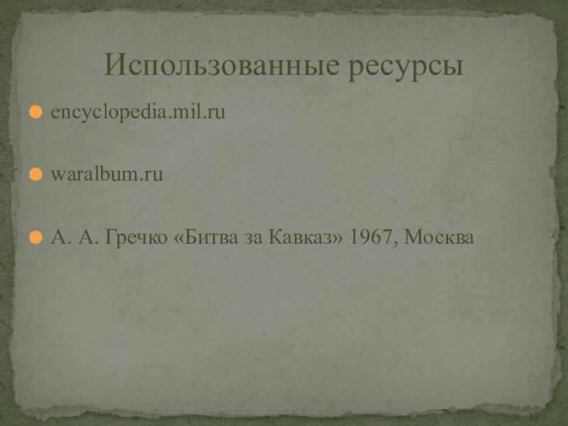 encyclopedia.mil.ruwaralbum.ruА. А. Гречко «Битва за Кавказ» 1967, МоскваИспользованные ресурсы