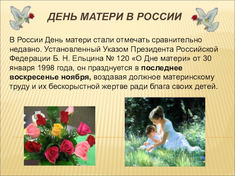 сравнительно недавно. Установленный Указом Президента Российской Федерации Б. Н. Ельцина № 120 «О Дне матери» от 30 января 1998 года, он празднуется в последнее воскресенье ноября, воздавая должное материнскому труду и их бескорыстной жертве ради блага своих детей.