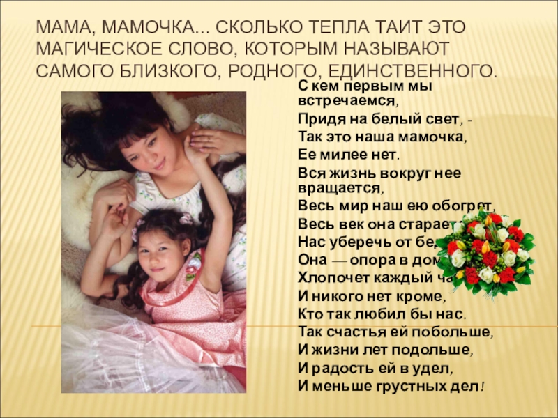 Слайд 21МАМА, МАМОЧКА... СКОЛЬКО ТЕПЛА ТАИТ ЭТО МАГИЧЕСКОЕ СЛОВО, КОТОРЫМ НАЗЫВАЮТ САМОГО